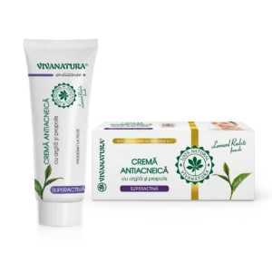 Cremă Antiacneică SUPERACTIVĂ cu argilă activă și propolis este un remediu 100% natural în tratarea acneei. Produsul este foarte eficient datorită conținutului de substanțe active din plante, uleiuri esenţiale de tea tree, argilă și propolis. Aceste ingredientele au un puternic rol antibacterian, antimicotic, antifungic, dezinfectant.